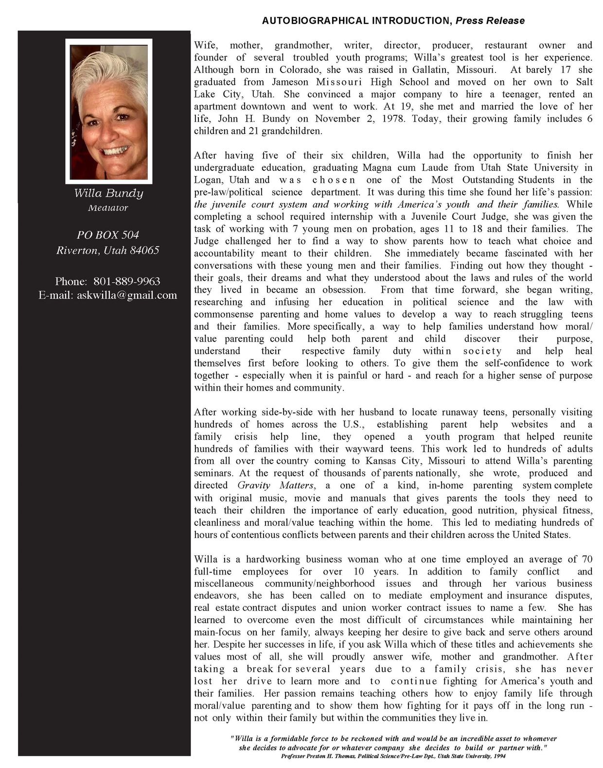 Willa Bundy graduated from Utah State University with a bachelor’s degree in political science/Pre-Law, with a Basic Mediation training certificate from the University of Utah. Through 35 years as an employer, real estate developer and owning various businesses, she has negotiated and mediated conflicts in business in the following areas:
